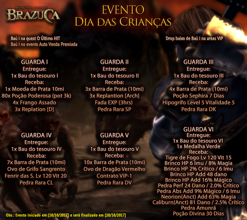 Dia das Crianças no WYD BzCOlá jogadores! O evento de Dia das Crianças no WYD BzC 2017 já está ATIVADO e existem várias formas de se obter o Baú do Tesouro I, A mecânica do evento funciona da seguinte maneira (leia com atenção): Os Guardas Reais do evento estarão no Reino (entre o reino vermelho e o azul). Teremos no total 11 NPC’s de troca, onde 6 deles estarão trocando seu baú por algum PRÊMIO, e os outros 5 estarão trocando seu baú (com chance de falha) para o próximo baú, por exemplo: Entregou o baú do tesouro I para o [NPC I: PróxBaú], existem chances de ele Apagar seu Baú I e não lhe dar nada em troca, ou ele pode apagar seu baú I e lhe dar de volta o Baú II, para que você possa escolher se quer trocar o Baú II por prêmios ou tentar a sorte no Baú III.