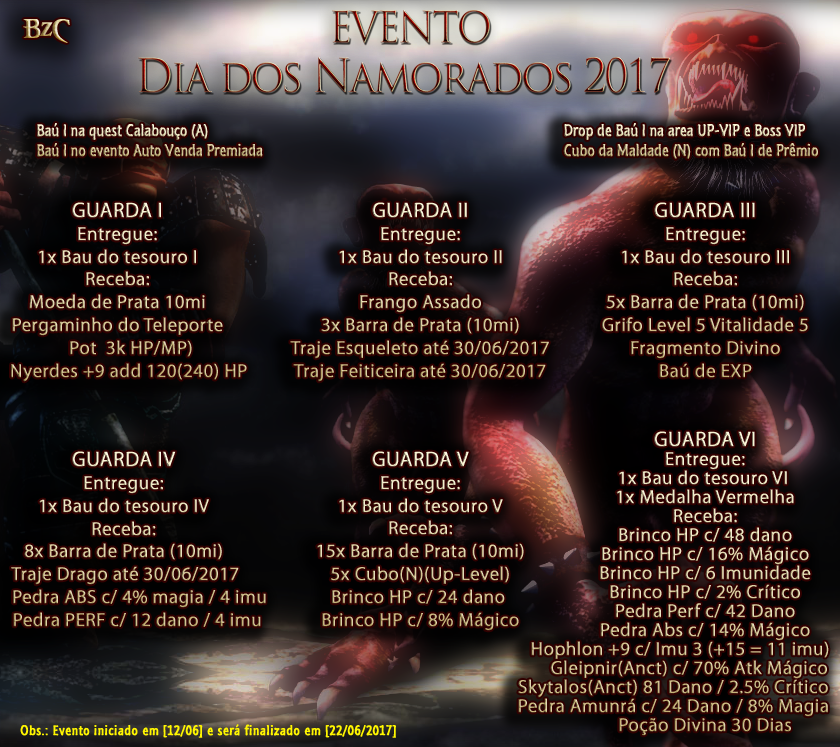 Evento de Dezembro 2017Olá jogadores O evento Novembro 2017 BZC será ativado amanhã, 3/12/2017,e existem várias formas de se obter o Baú do Tesouro I. A mecânica do evento funciona da seguinte maneira (leia com atenção): Os Guardas Reais do evento estarão no Reino (entre o reino vermelho e o azul). Teremos no total 11 NPC’s de troca, onde 6 deles estarão trocando seu baú por algum PRÊMIO, e os outros 5 estarão trocando seu baú (com chance de falha) para o próximo baú, por exemplo: Entregou o baú do tesouro I para o [NPC I:PróxBaú], existem chances de ele Apagar seu Baú I e não lhe dar nada em troca, ou ele pode apagar seu baú I e lhe dar de volta o Baú II, para que você possa escolher se quer trocar o Baú II por prêmios ou tentar a sorte no Baú III.